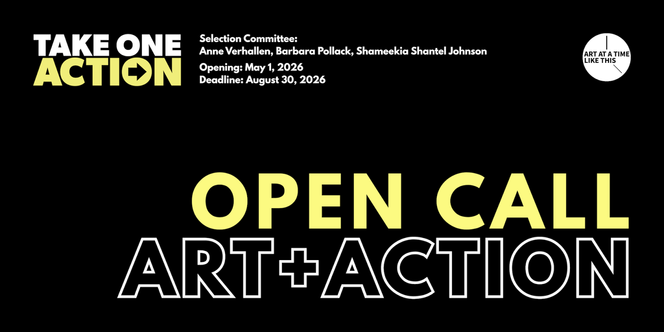 Launching May 1, 2026, Art at the Time Like This presents its open call for Take On Action, a public art project and virtual exhibition inviting artists to propose one action everyday people can take to protect democracy. Responding to civic and environmental crises–including threats to civil liberties and global human rights—this project asks how art can move beyond reflection and towards participation. What does it mean to act, collectively, in a time like this?