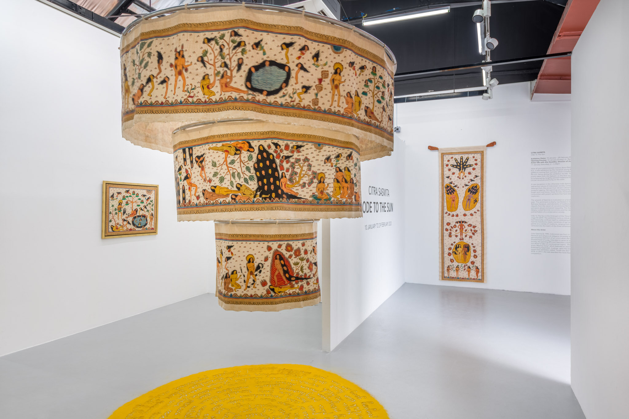 Installation shots from Ode To The Sun, acrylic on kamasan canvas, turmeric powder by Citra Sasmita