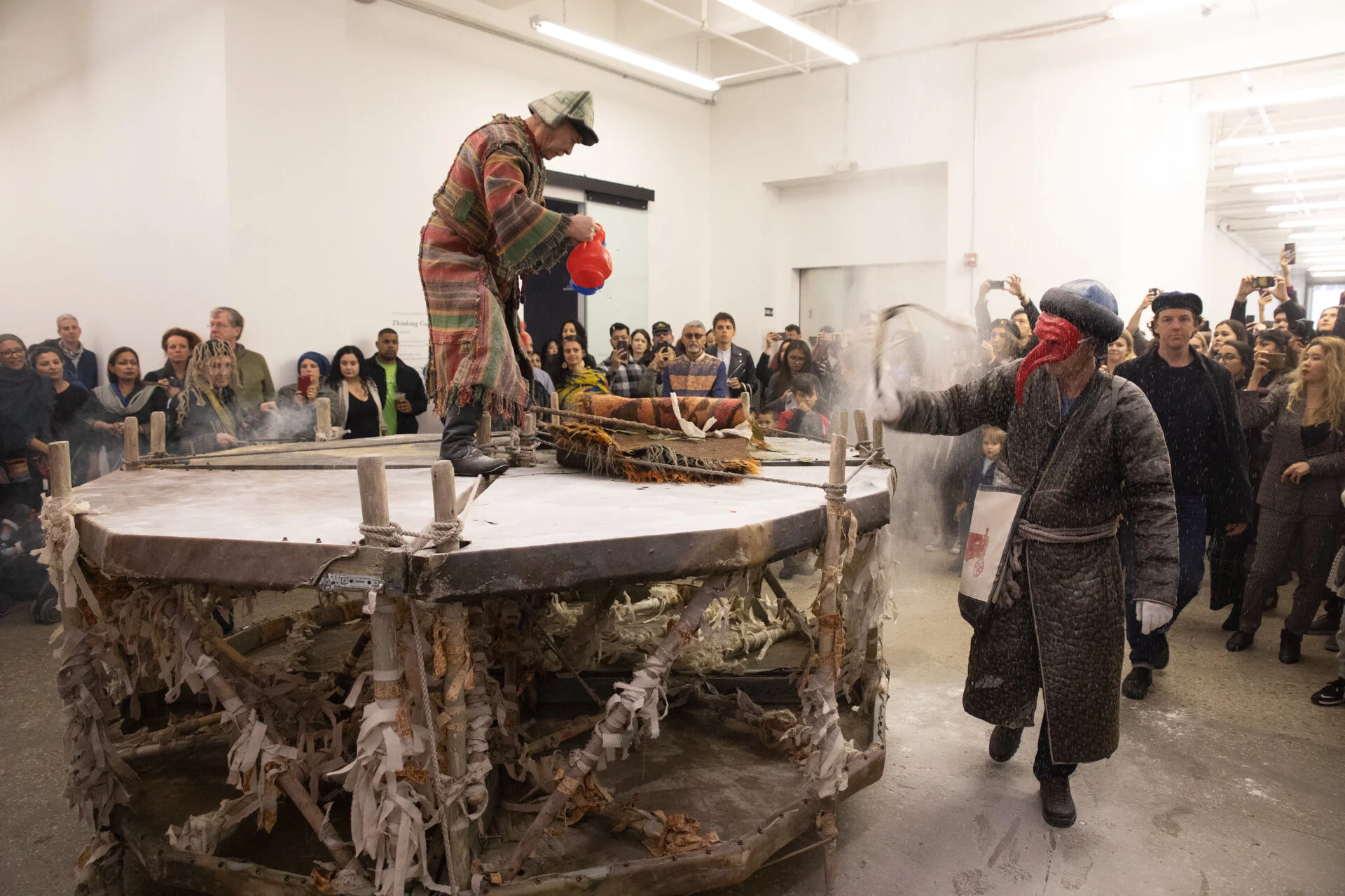As a processional ceremony, the 2018 performance in Jersey City involved the artists rolling and sounding off one of their largest drums to date (specially built for this iteration). With a captivated crowd following them across Mana Contemporary’s outside grounds, the four Kyzyl Tractor members burned sage, generating large clouds of smoke while sprinkling water and making deep grunting shaman sounds. Today, it has been scientifically proven that sonic waves can block some forms of bacteria and viruses. For instance, the sound of church bells during the 1770s plague epidemic in Russia helped to rehabilitate cities like Moscow and St. Petersburg. The force required to sound a bell, both physically and symbolically, allows for repetitive waves to cure ailments and eradicate harmful organisms. Drum-based rituals like this one are still widely practiced by shamans in Latin America, Southeast Asia, Africa, and Siberia. Kyzyl Tractor has performed “Purification” in Prague, Perm, Vienna, Shymkent, Almaty, and Jersey City for the first time.