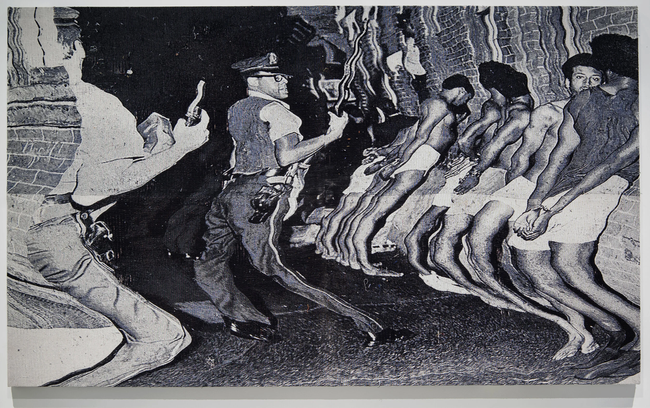 My work explores the historical relationships between Jacquard tapestry weaving and contentious photo-based representations (televisual and cinematic) of black masculinity. Invented in the late 18th century, Jacquard tapestries introduced a method of binary coding, which was later used to develop computational systems and images produced on analog and digital screens. My use of Jacquard tapestries draws material and conceptual connections between media’s distorted representations of black men and weaving. Starting with an image, I work with weavers to fabricate the source-picture into a woven tapestry. As I warp the images before weaving, textiles offer an opportunity to develop the relationship between cloth, screen culture, and the distortion of black bodies in the American imagination. It is important to note that the image is woven, and not printed- on-fabric. The woven image causes the representation to be more an object and ground, against which other applications can be mounted. Through physical acts of sanding, brushing, picking, dyeing, and collaging, I address conceptual concerns of the image’s stability and meaning. While my work materializes and collapses photography’s genealogical link with weaving and other modes of representation – historically paintings were translated into tapestries, prints, and photographs – obscuring the image by distressing threads and staining with dyes challenges photographic accuracy. Fraying an image’s validity renders meaning, thought absolute and static, mobile. This disintegration of truth, and integration of disciplines, expresses my commitment to developing historical and conceptual connections between disciplines and computational coding as they inform the power of representation of black masculinity in media, while extending photography’s possibilities. Furthermore, textile, as a metaphor, is deployed to address the entanglement of social, cultural, and political discourses circumscribing black masculine forms. Through Jacquard tapestry weaving, I seek to spotlight the complexities of attempting to define black male subjects through surface and corporeality.